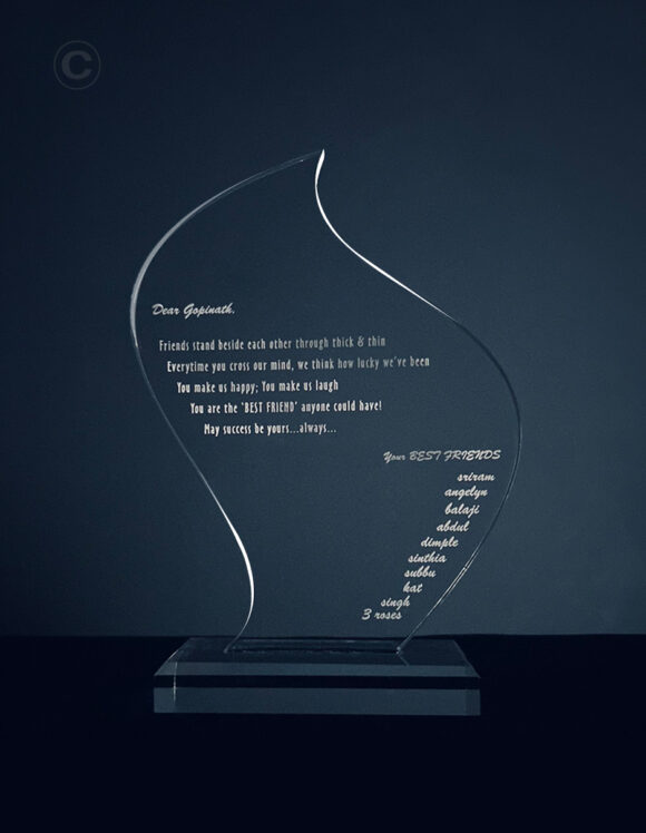 Impress your recipients with custom-cut acrylic awards-the newest, most cutting-edge addition to our repertoire, Using this versatile material, the possibilities are endless!. Acrylic can be cut into almost any shape, customized with color via our Color-fuse process, or even laser-engraved for a more classic look. With these distinctive bespoke awards, the options are limited only by your imagination..