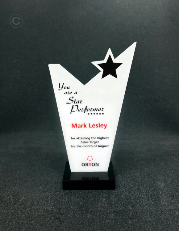 Impress your recipients with custom-cut acrylic awards-the newest, most cutting-edge addition to our repertoire, Using this versatile material, the possibilities are endless!. Acrylic can be cut into almost any shape, customized with color via our Color-fuse process, or even laser-engraved for a more classic look. With these distinctive bespoke awards, the options are limited only by your imagination.