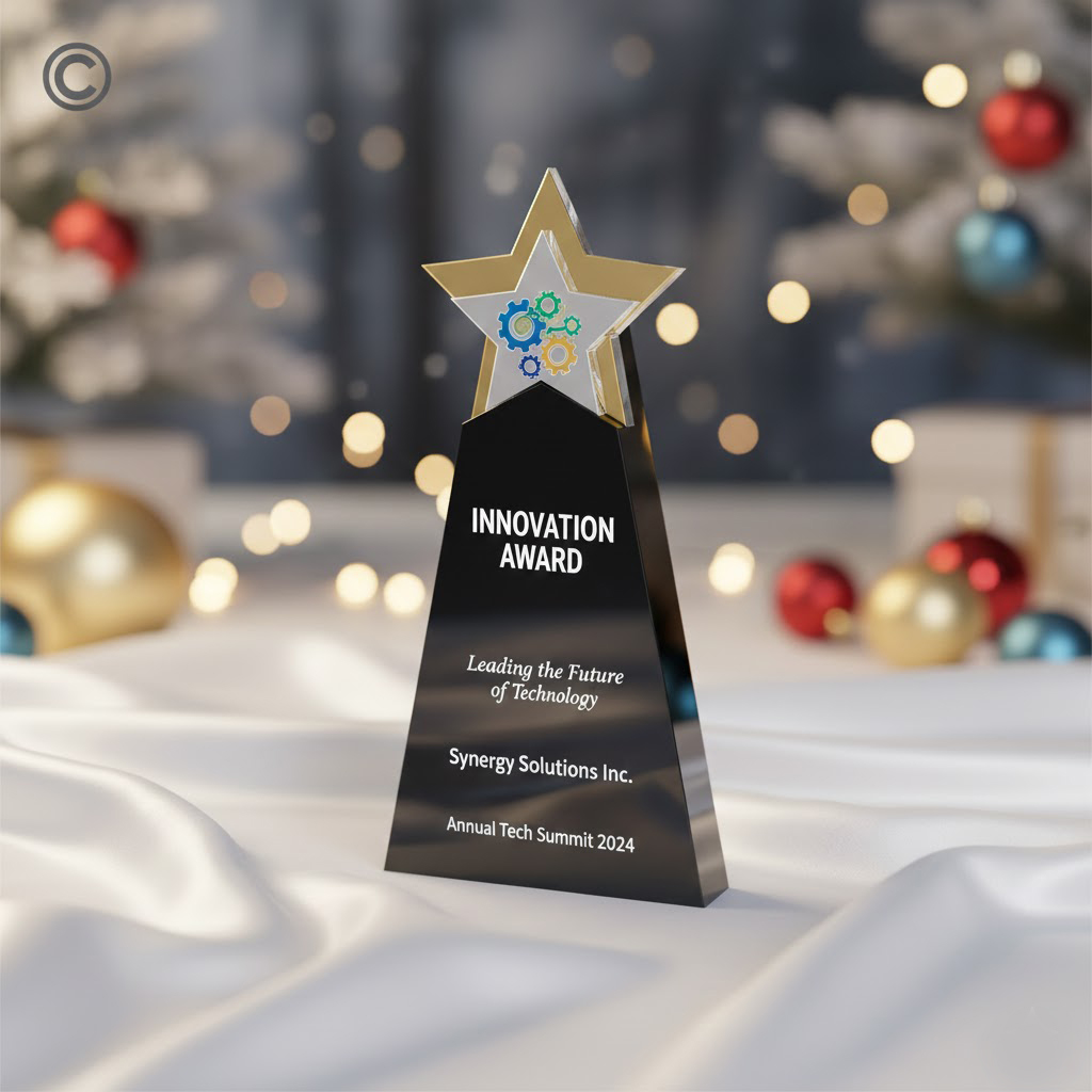 Celebrate your team’s success with our stunning Acrylic Star Awards Mementos. Featuring a modern black and gold design, these bespoke pieces are perfect for annual conventions and employee recognition.”