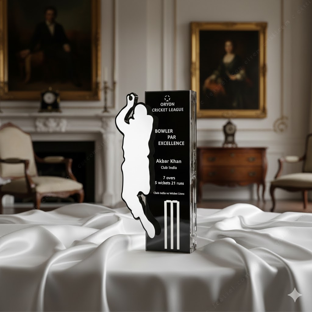 This trophy features a skillfully sculpted cricket bowler in full stride, capturing the dynamic essence of their action.